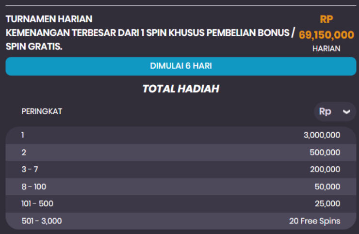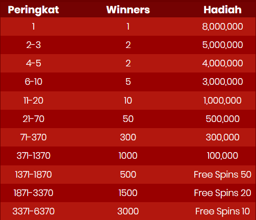 6. Hadiah akan diberikan berupa nominal Rp 8,000,000; Rp 5,000,000; Rp 4,000,000; Rp 3,000,000; Rp 1,000,000; Rp 500,000; Rp 300,000; Rp 100,000; Free Spins 50; Free Spins 20; dan Free Spins 10, yang dapat dimainkan di permainan yang memenuhi syarat selama periode promosi.