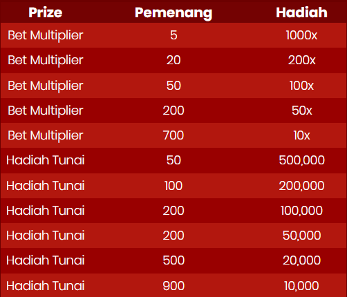 8. Prize Drop yang diberikan berupa 1000x Multipliers taruhan, 200x Multipliers taruhan, 100x Multipliers taruhan, 50x Multipliers, 10x Multipliers taruhan, Rp 500,000; Rp 200,000; Rp 100,000; Rp 50,000; Rp 20,000 dan Rp 10,000 yang bisa dimenangkan dalam permainan yang memenuhi dalam periode promosi