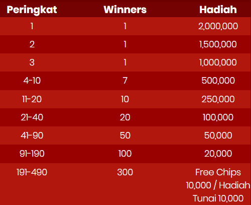2. Pemain memiliki kesempatan untuk mendapatkan Total hadiah uang tunai IDR 1,497,375,000,- selama masa promosi