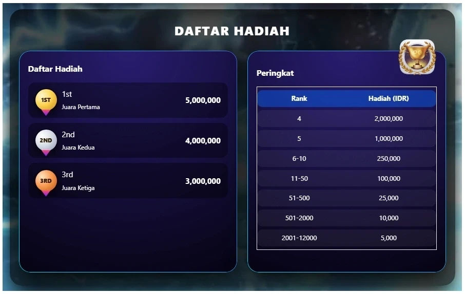 2. Total hadiah sebesar IDR 3.000.000.000 akan dibagikan kepada 10.000 pemain setiap bulannya dengan skor tertinggi pada papan peringkat.